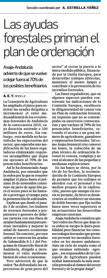 La Consejería de Agricultura ha ampliado el plazo para solicitar las ayudas dirigidas a incrementar el valor medioambiental de los ecosistemas forestales de Andalucía de la convocatoria 2019, cuya dotación asciende a 106 millones de euros. Sin embargo, como publica la periodista Estrella Yáñez en Diario de Sevilla, esta medida no ha satisfecho las expectativas del sector, que esperaba una modificación de las bases reguladoras eliminando requisitos incumplibles que dejan sin opciones al 70% de los potenciales beneficiarios.