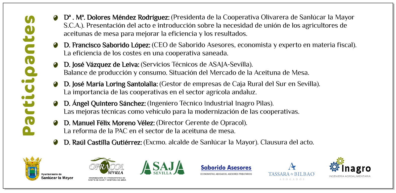 En el encuentro, que contará con la colaboración de ASAJA-Sevilla, se abordarán asuntos de gran interés para los olivareros, como la necesidad de unión de los agricultores de aceituna de mesa, la eficiencia de los costes en una cooperativa saneada, el balance de producción y consumo de aceituna de mesa y la situación del mercado, la importancia de las cooperativas en el sector agrícola andaluz y las mejores técnicas para su modernización, así como la reforma de la PAC en el sector de la aceituna de mesa (ver programa adjunto).