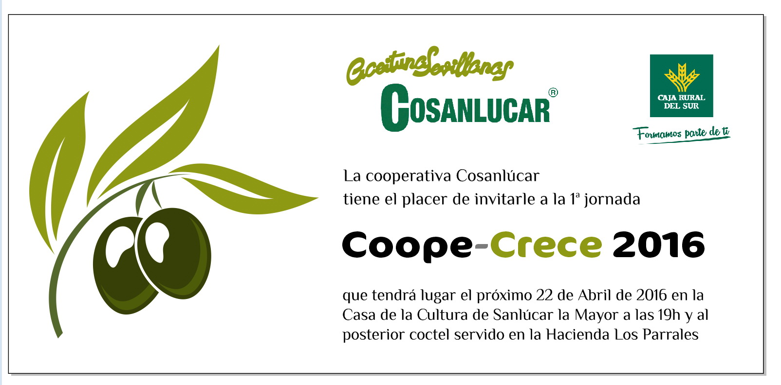 La cooperativa Cosanlúcar celebrará el próximo viernes, 22 de abril, la I Jornada Coope-Crece 2016, que tendrá lugar en la Casa de la Cultura de Sanlúcar la Mayor a las 19 horas.